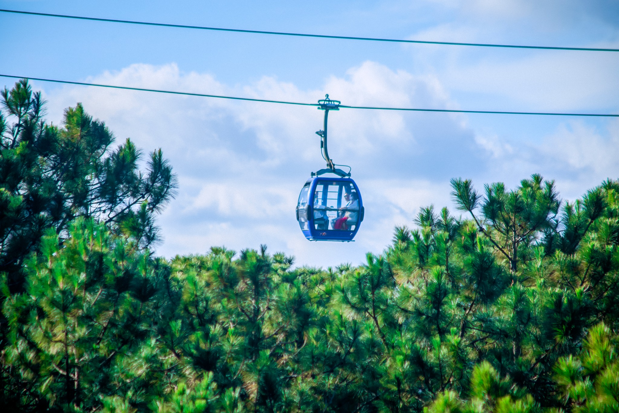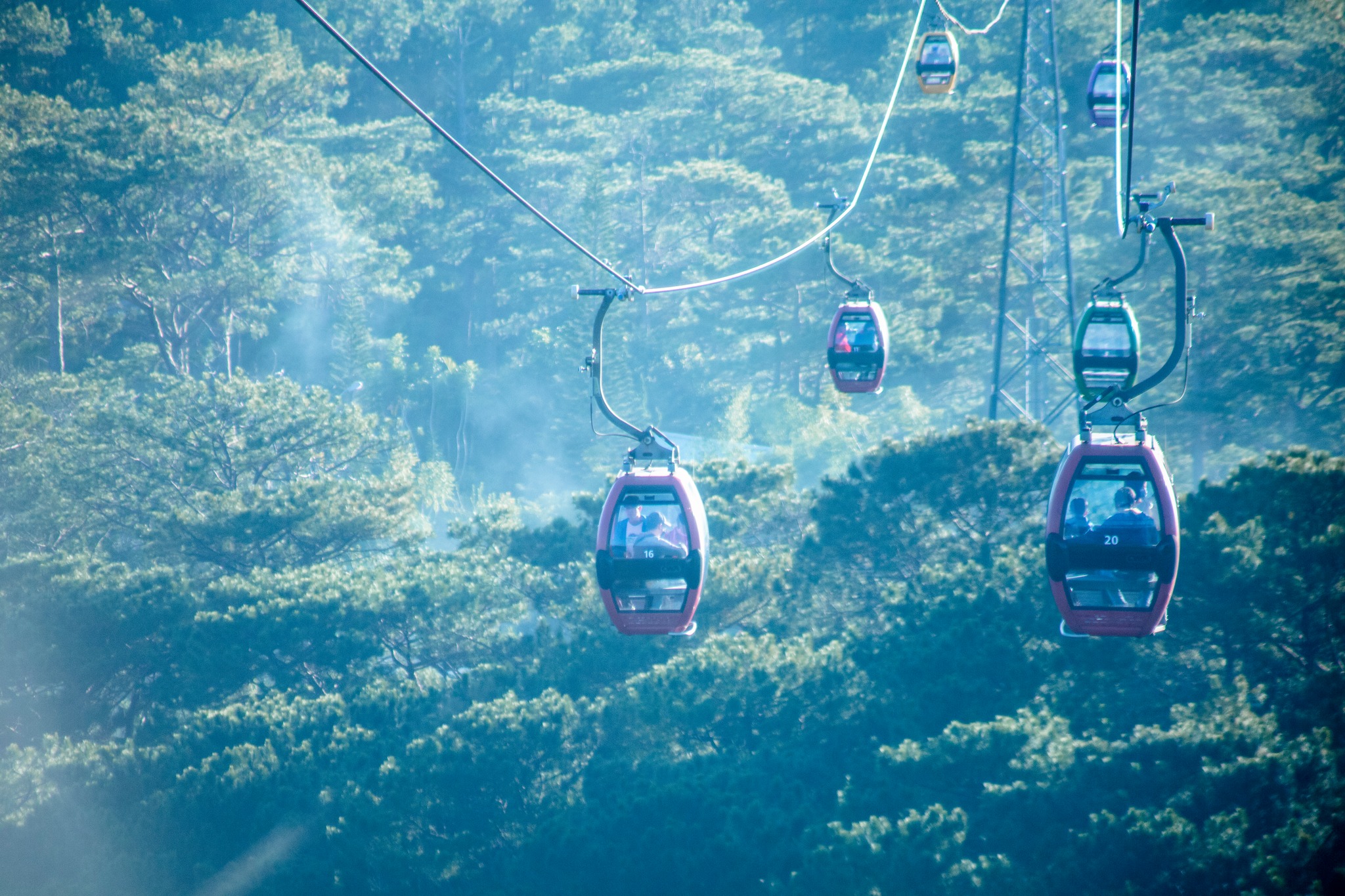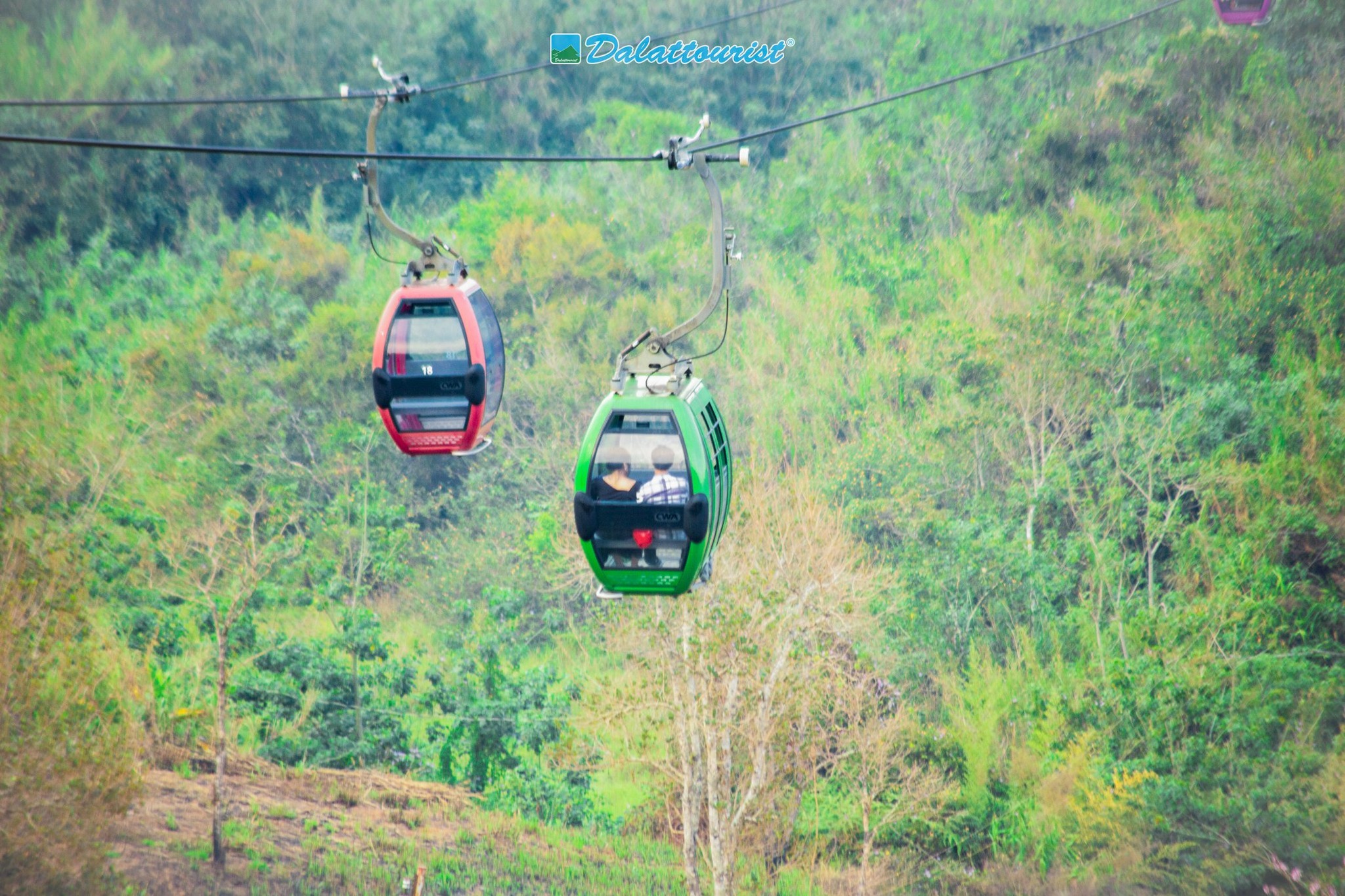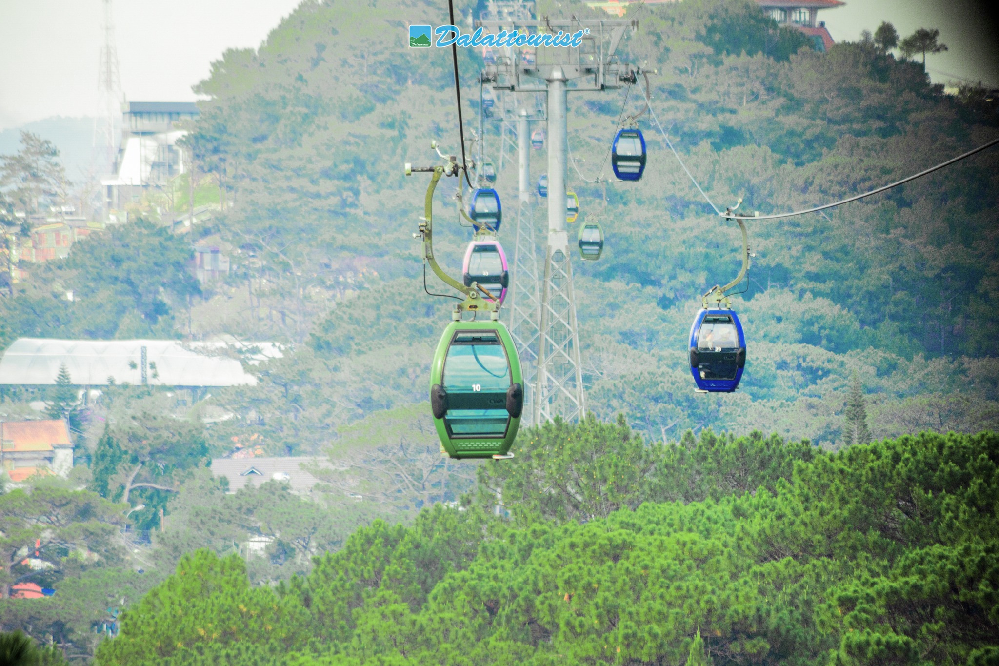 Khi đi trên cáp treo Đà Lạt, bạn sẽ được chiêm ngưỡng bức tranh thiên nhiên với mảng màu rất khác của một vùng phố núi. Cảm giác ngồi trong cabin với bốn mặt kính, xung quanh lúc này là một màu xanh thẳm của rừng thông bạt ngàn. Phóng tầm mắt ra phía xa là trùng điệp núi đồi thoắt ẩn thoắt hiện giữa những đám mây trắng bồng bềnh.